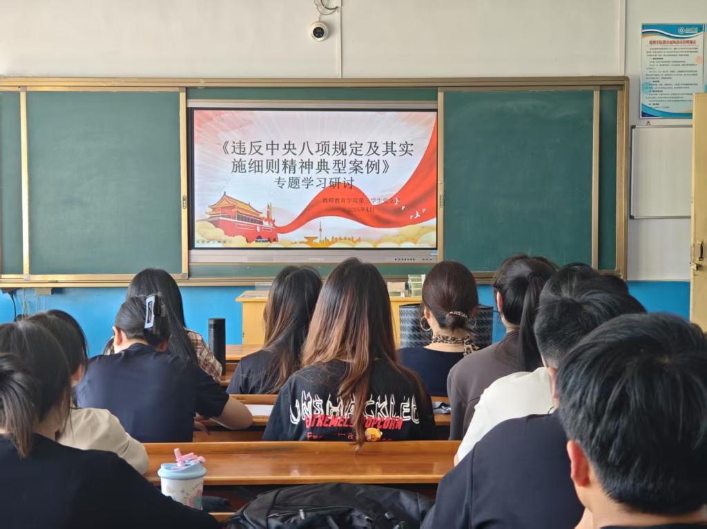 2025年4月29日上午,教师教育党委在知行楼302会议室,召开理论学习中心组(扩大)典型案例专题研讨会,学院党政班子成员、党支部书记参加会议。会议首先收看了警示教育片《勇吹冲锋号》第3集《铁规矩硬杠杠》,随后大家对《违反中央八项规定及其实施细则精神典型案例》中某高校原党委常委、副校长田某接受可能影响公正执行公务的宴请案例进行了深入剖析,并做了研讨发言。
