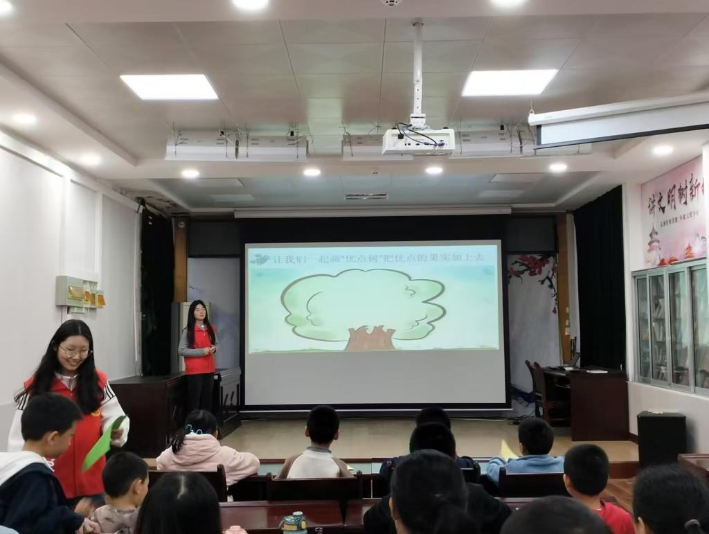 活动伊始,志愿者让孩子们通过绘画的方式思考自身的优点,帮助他们完善自己心中的“优点树”,孩子们兴致勃勃的与同伴讨论,极大提高了孩子们参与活动的积极性。志愿者们还充分利用水瓶、纸张等废弃材料和图书,与孩子们一起开展了新颖有趣的“折纸撑书”游戏。游戏过程中,志愿者们不断为孩子们提供积极的情绪价值,敏锐地捕捉他们的每一个努力和进步,并及时给予积极的反馈,以帮助孩子们建立自信,悦纳自我。活动最后,志愿者还引导孩子们在图书馆内寻找与“自信”主题相关的图书或绘本。孩子们经过简单的阅读并分享了阅读感想后,志愿者们也结合自身经验向孩子们教授了建立自信的方法。