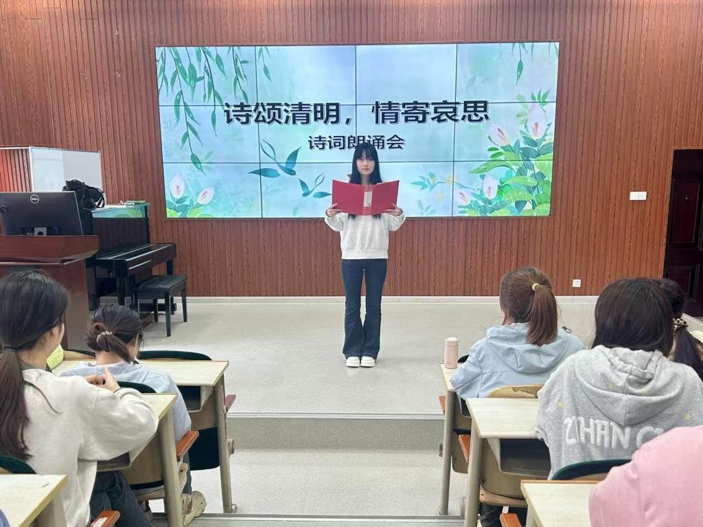 活动伊始,主持人首先以生动的语言讲述了清明节的起源与发展,详细阐释了这一传统节日从农事节气到人文节日的历史演变。在随后的朗诵环节中,同学们以饱满的热情和真挚的情感,演绎了多首与清明相关的经典诗词。既有杜牧《清明》中“清明时节雨纷纷,路上行人欲断魂”的经典重现,也有苏轼《江城子·乙卯正月二十日夜记梦》里“十年生死两茫茫,不思量,自难忘”的深情演绎。同学们还创新性地选取了现代诗歌作品,用当代青年的视角诠释清明文化,展现了对传统文化的创造性转化和创新性发展。活动现场气氛庄重而温馨,同学们声情并茂的表演将清明节蕴含的思念之情与生命感悟表现得淋漓尽致。一首首饱含深情的诗词,不仅让在场师生感受到传统文化的魅力,更引发了大家对生命意义的深刻思考。