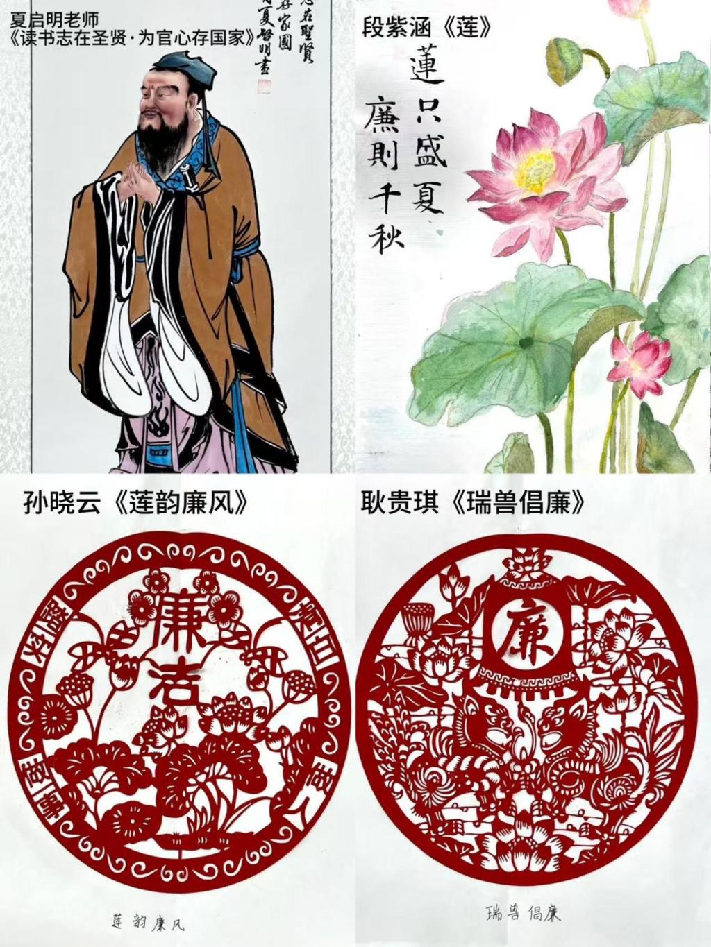 张书悦同学则从身边小事出发,用视频记录了405宿舍四个女孩在面对价值观冲突时的困惑、挣扎与和解,他们用老一辈的教导、最朴素的行动诠释了廉洁的本质——它并非高高在上的道德说教,而是对生活的敬畏,对他人的负责,对自己的坦诚。汤璐语同学将目光聚焦到“苔痕”这一微小的自然现象,用苔痕隐喻廉洁文明的深刻内涵;用生态修复技术引出廉洁生态的现代启示以及校园建设,将廉洁文化聚焦于现实生活。耿贵琪同学从剪纸中勾勒出清正的 “廉” 字,莲花绽放、神兽守护,传统艺术里,藏着中国人对廉洁最本真的向往。段紫涵同学水墨画中的“莲只盛夏,廉则千秋”,短短八字,却蕴含着深刻的人生哲理与道德期许。孙晓云同学在工艺创廉作品《莲韵廉风》中深度融合“莲”与“廉洁”的文化意象,通过精湛的刀工与巧妙的构图,传递“踏实做事、清白做人”的价值追求。
