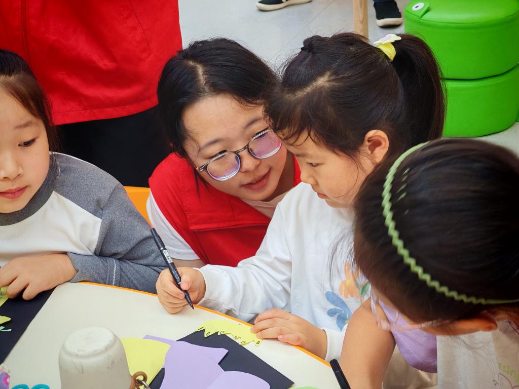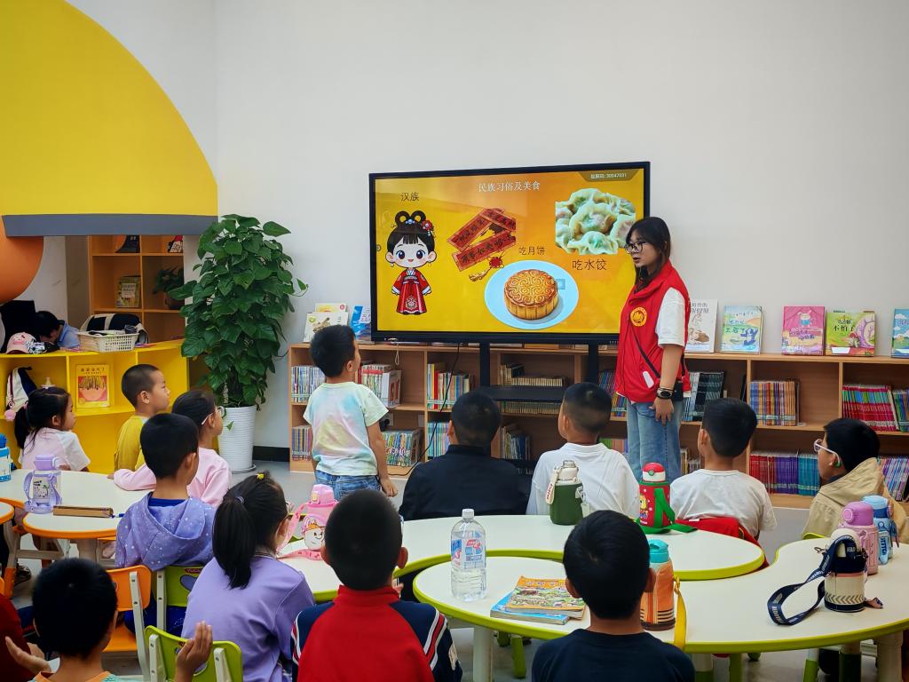 活动伊始,志愿者以一段生动的民族文化视频拉开序幕。随后志愿者用通俗易懂的语言,向孩子们详细讲解了各民族的独特习俗与特色美食,从服饰纹样到节庆传统,从特色佳肴到生活礼仪,让孩子们在聆听中初步构建起对民族文化的认知框架。手工与游戏环节将活动气氛推向高潮:志愿者一对一指导孩子们折叠民族帽,让孩子们在手工中感受民族文化;随后的“民族蹲”游戏中,孩子们在欢声笑语中快速熟悉各民族名称,进一步拉近了与民族文化的距离。在“石榴绘梦”环节,志愿者引导孩子们亲手剪出象征民族团结的石榴造型,同时,孩子们将心中对民族文化的印象与想象也勾勒在了画纸上,孩子们用天真烂漫的话语,讲述着对各民族文化的理解与对民族团结的向往,纯粹的表达让现场充满了温暖与感动。