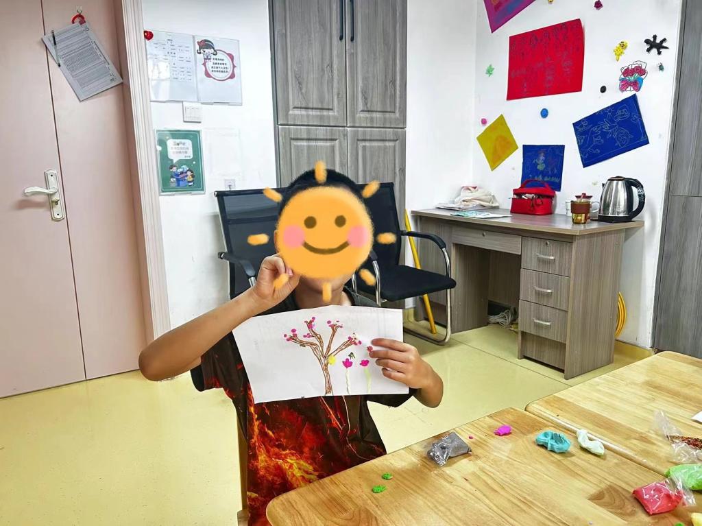 活动开始前,志愿者与孩子们进行简单的交流,并引导他们想象即将制作的大树的模样。活动开始,志愿者精心准备了色彩鲜艳的彩泥、模具和参照画册,组织小朋友们开展捏太空泥活动,志愿者展示成品树干的图片,并逐一介绍所需材料和工具,演示基本的粘土操作技巧,如揉捏、擀平、切割等。操作过程中,志愿者让孩子们选择喜欢的粘土,教他们如何将粘土揉捏柔软,将树叶轻轻贴在树干上,并用工具在树干上画出细小的纹理,以模拟真实树皮的质感,同时志愿者鼓励孩子们自由发挥,确保每个孩子都能在活动中找到成就感和满足感。