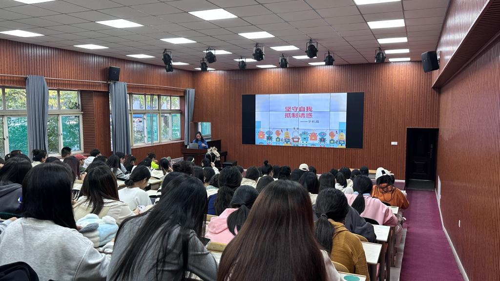 本次主题讲座由张楠老师主持开展,张楠老师从互联网时代的便弊、网络上瘾的类型、网络依赖的危害、提高自控力的方法等多个方面与现场同学展开热烈讨论和交流,同学们结合自身经历,积极分享自己在日常上网的心理状态。随后,张楠老师结合现实案例,通过播放网络防沉迷相关视频短片,号召同学们控制手机等电子产品的使用时长,拒绝浏览不良信息,不沉迷网络游戏,形成健康、文明上网好习惯。