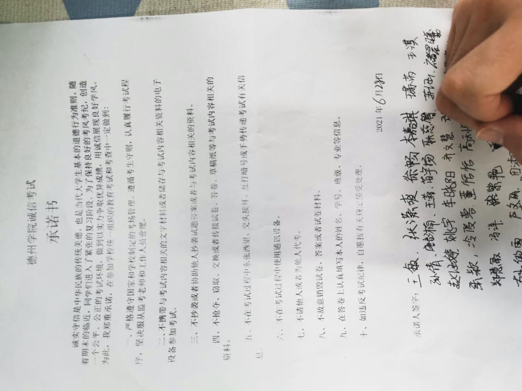 为构建我校学风建设的长效机制,营造良好的学习氛围,提高人才培养质量,引导同学主动学习学风建设思想,加强学风建设,提高学习积极性,形成良好的诚信之风,促进考风根本好转,端正考试态度,促进公平竞争环境的形成。德州学院祖雄兵视频17分钟吃瓜下载于2021年6月28日成功开展诚信考试承诺书签名活动。