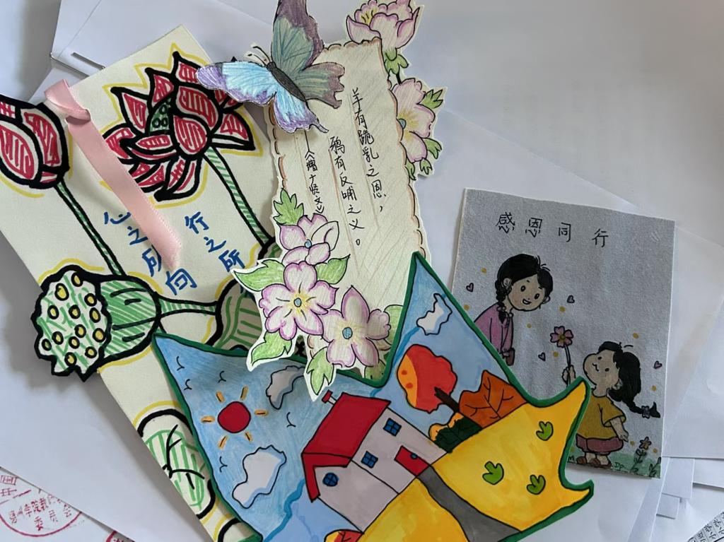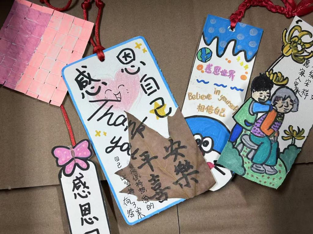 活动开始前,同学们收集了许多落叶、塑料、卡纸、纸盒等材料,为制作精美的书签做好充足的准备。活动开始,主讲人首先通过一个简短的小视频为同学们介绍了书签的发展历程和用途,使同学们对书签有了更多方面的了解。随后,同学们开始动手制作,他们用剪刀将卡纸裁剪成合适的形状和大小,将用落叶、纸盒等材料做好的装饰物粘贴到书签上,并用彩笔对书签进行最后的填充,制成了一个个精美的书签。有的同学选择描绘温馨的家庭场景,有的则搭配文字记录下了对老师的感恩之情,每一张书签都是独一无二的艺术品,同学们也深深地意识到了书签不仅仅是标记书页的工具,更是情感交流的桥梁,还传递着同学们对美好未来的期许与愿景。同学们在制作的过程中感受到了满满的幸福感和归属感,文化的传承与创新也因此更具意义。