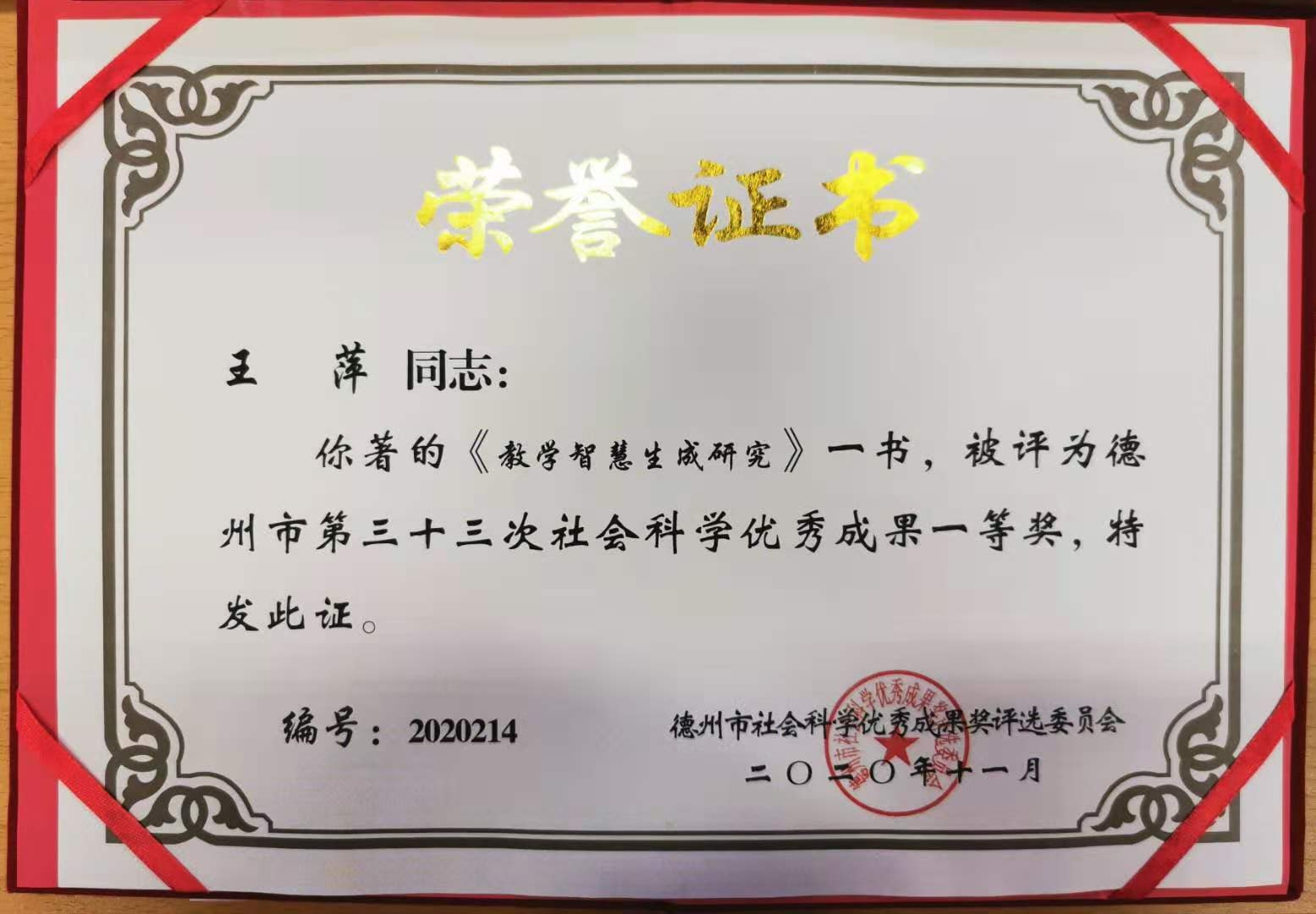 近日,祖雄兵视频17分钟吃瓜下载王萍教授专著《教学智慧生成研究》荣获德州市第三十三次社会科学优秀成果一等奖。