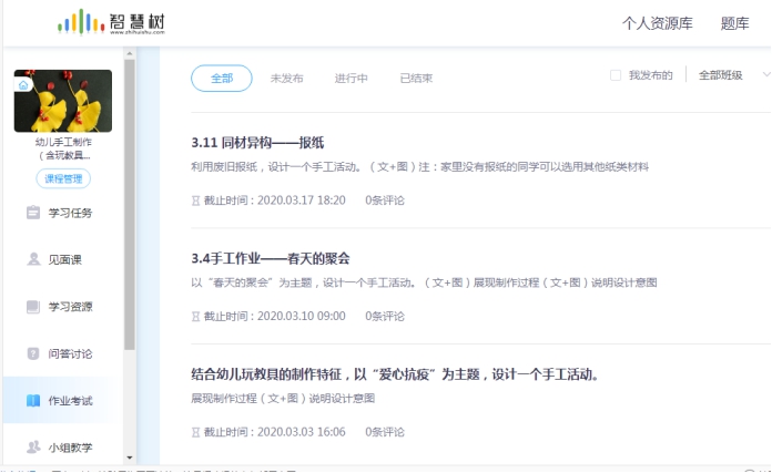 《幼儿手工制作(含玩教具)》作为一门旨在提升学生专业技能、丰富专业情意、实践性较强的课程,其传统视角下的课堂面授教学与新颖的远程网络课堂教学形式存在较大的不同,网络教学中学生当堂的小组合作、手工材料的准备等方面都受到一定的影响。基于此,张阳老师结合当下“抗疫”背景与网络课堂教学的特点,将网上手工课堂分为三个环节进行:主题作业分享互评;幼儿手工理论知识讲授;跟随手工教程视频同步学习。