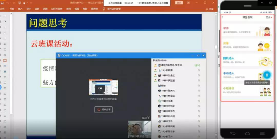 以上是今天线上教学第一课的简单总结,总体还算顺利,没有出现大问题,学生回答问题总体感觉比以往课堂活跃,也许这是不同于线下班级实体课堂的优势。