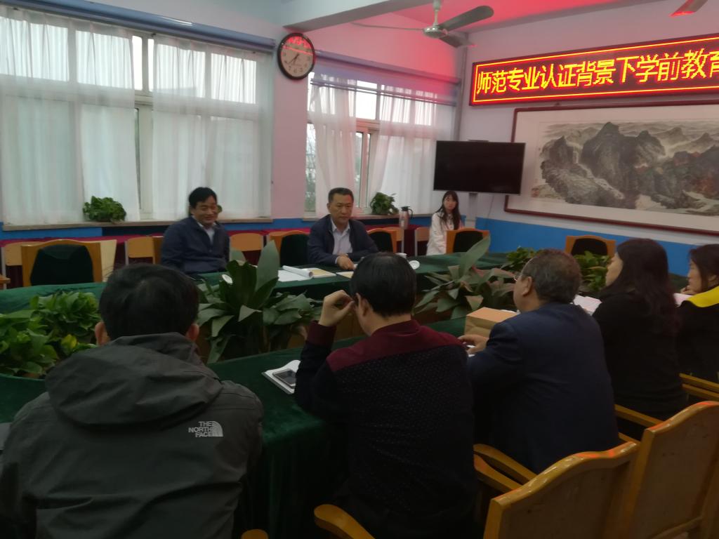 2019年4月17日,德州学院校长赵胜村、德州学院党委委员副校长张明征来我院调研。学校领导在我院党政负责人陪同下首先参观了教科院楼宇文化建设,并提出了建设性指导意见。随后,在三层会议室,学校领导就我院学前教育专业认证工作进行了专题调研。教科院院长王萍做师范专业认证工作汇报。赵胜村着重就学前教育专业认证工作中存在的需要学校层面予以协调解决的问题有针对性的进行发问和分析。