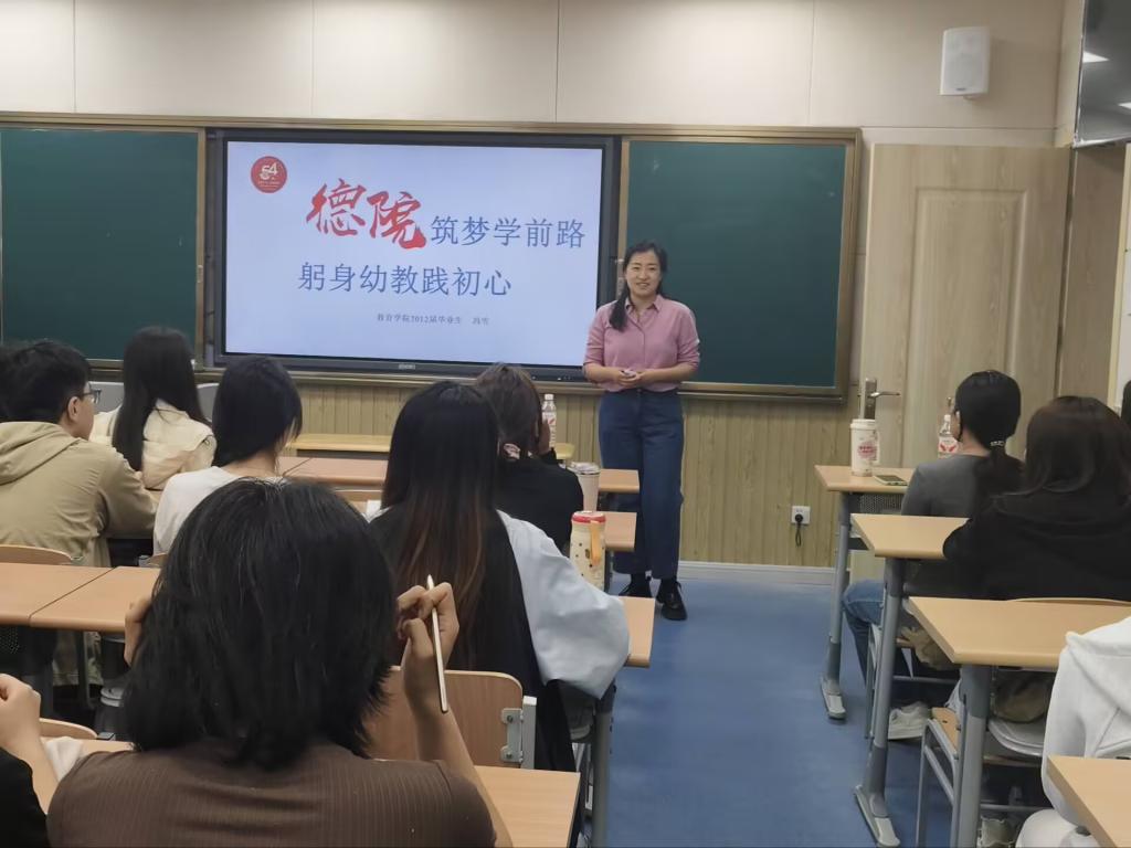 2012届学前教育专业校友、潍坊高新区欣诚幼儿园党支部书记冯雪围绕《德院筑梦学前路,躬身幼教践初心》主题,分享了她十余年的从业经验。她结合幼儿园日常教学案例,阐述了学前教育工作者须具备的专业技能与职业素养,包括观察儿童行为、设计适龄课程以及建立家园协作机制等具体内容。冯园长特别提到,面对特殊儿童教育时,需以耐心和科学方法制定个性化支持方案。此外,她建议在校生通过参与实习、观摩优质课例等方式积累实践经验,并强调教育者需持续提升专业能力与心理调适能力,以应对职业挑战。